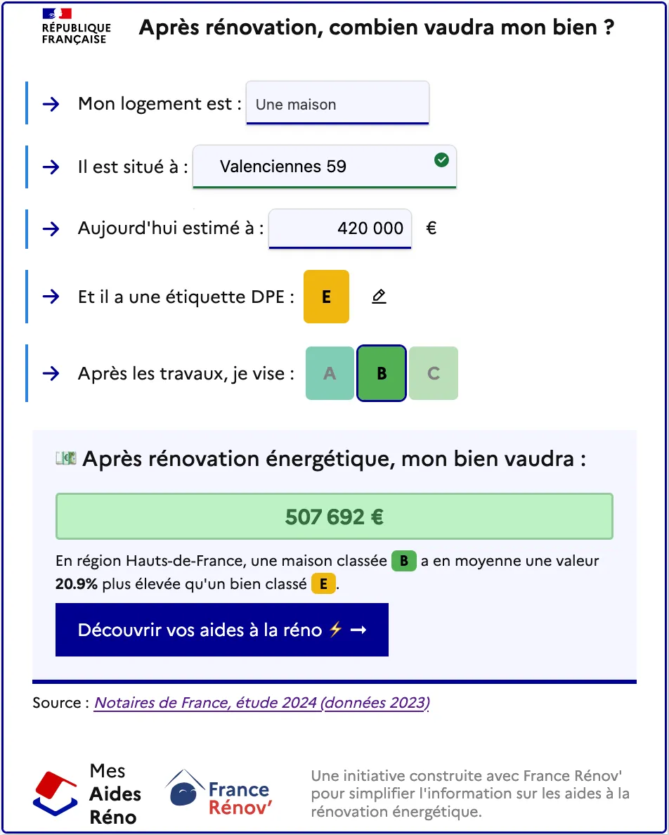 C’est pour répondre à cette question que le service public numérique Mes Aides Réno propose la première calculette Ma plus-value Réno, basée sur la dernière étude Valeur verte des logements des Notaires de France.